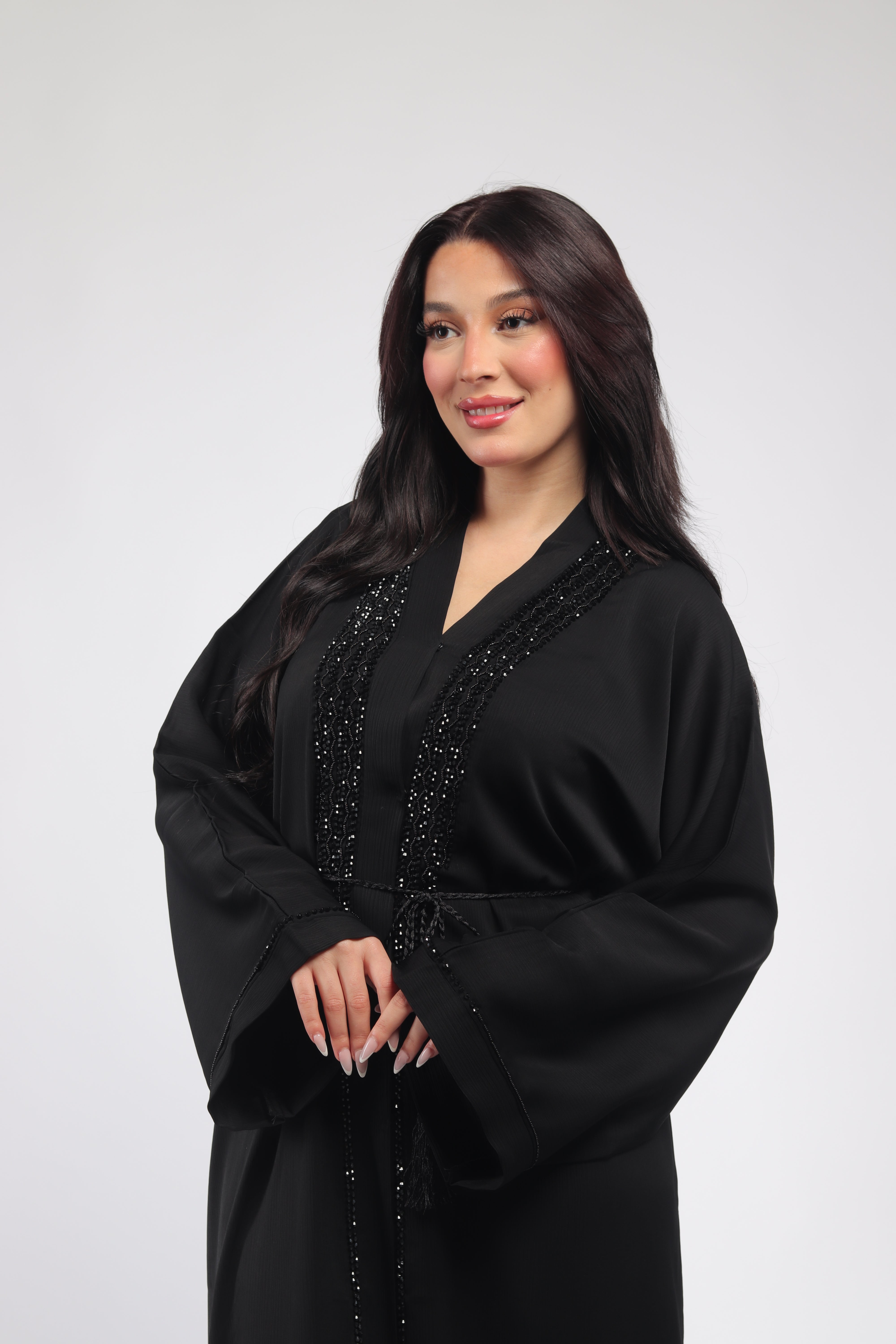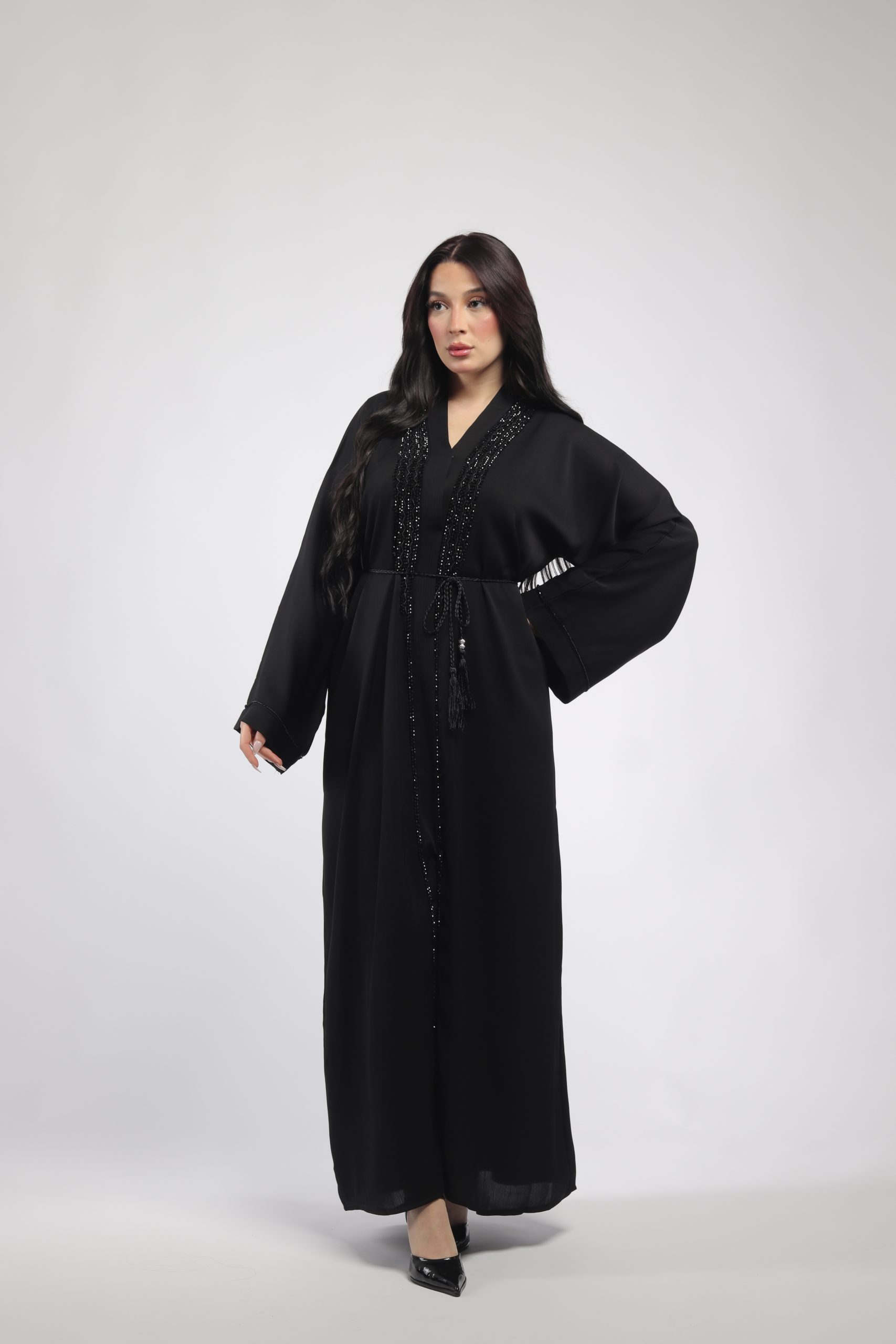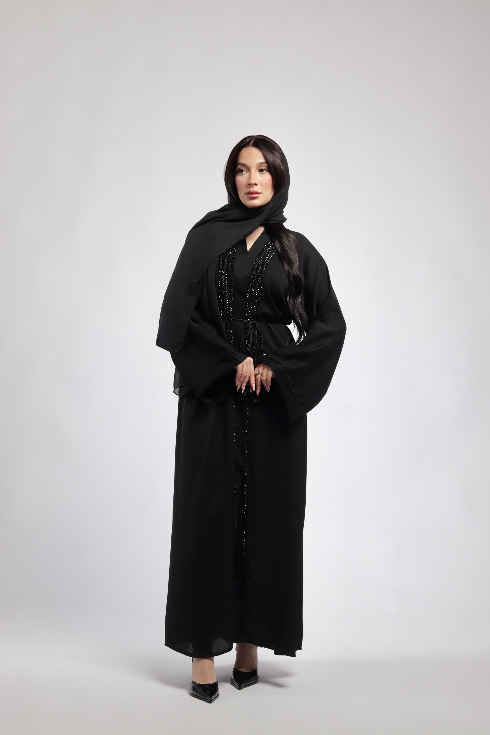 What truly makes this abaya stand out are the stunning black shiny bead details that adorn its fabric. These delicate beads shimmer subtly, catching the light with every movement, creating a unique and refined look. This touch of sparkle adds an understated glamour, perfect for those who appreciate a classy yet eye-catching style. The beadwork is thoughtfully arranged to enhance the abaya’s lines, lending a sophisticated touch that exudes both modernity and tradition.