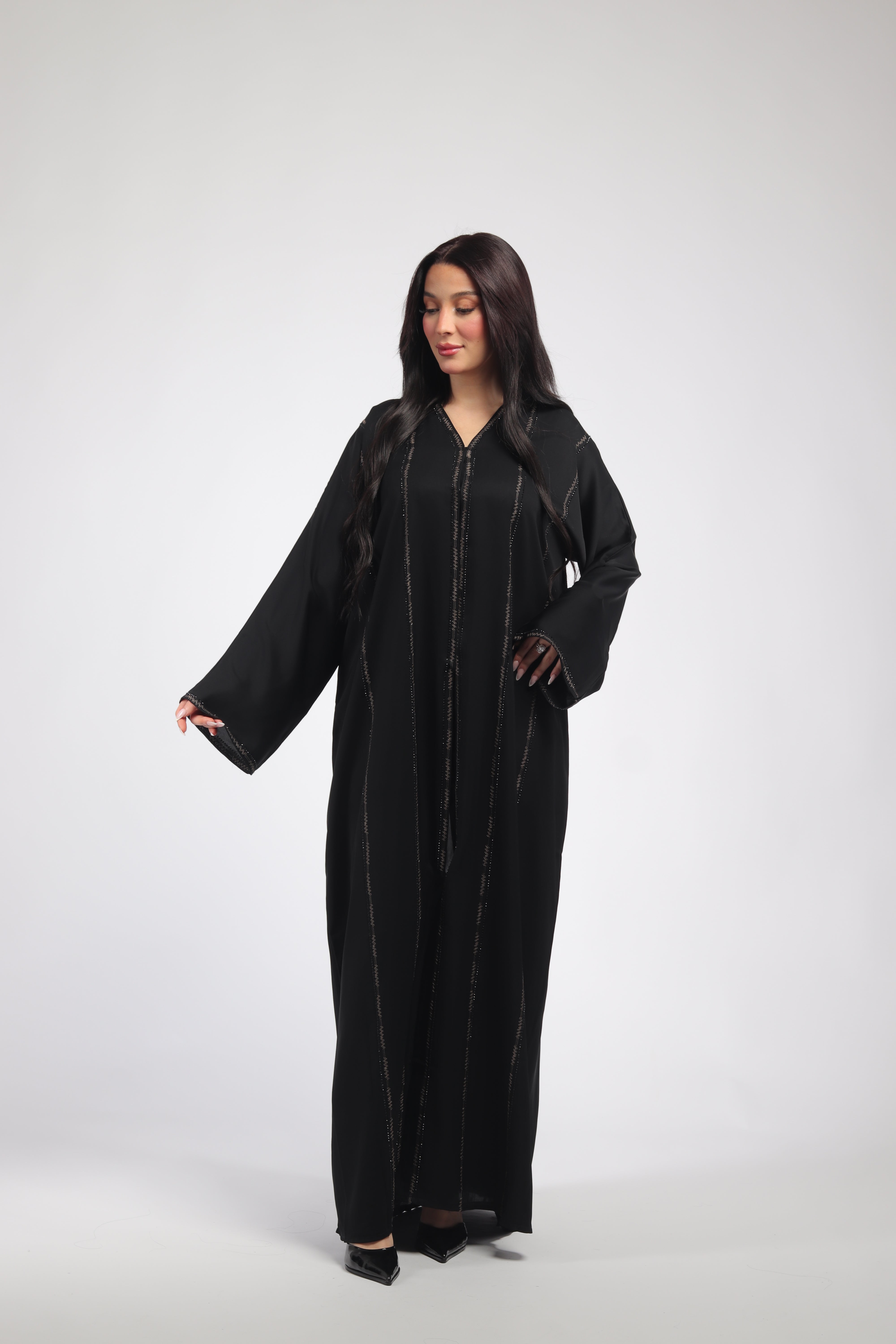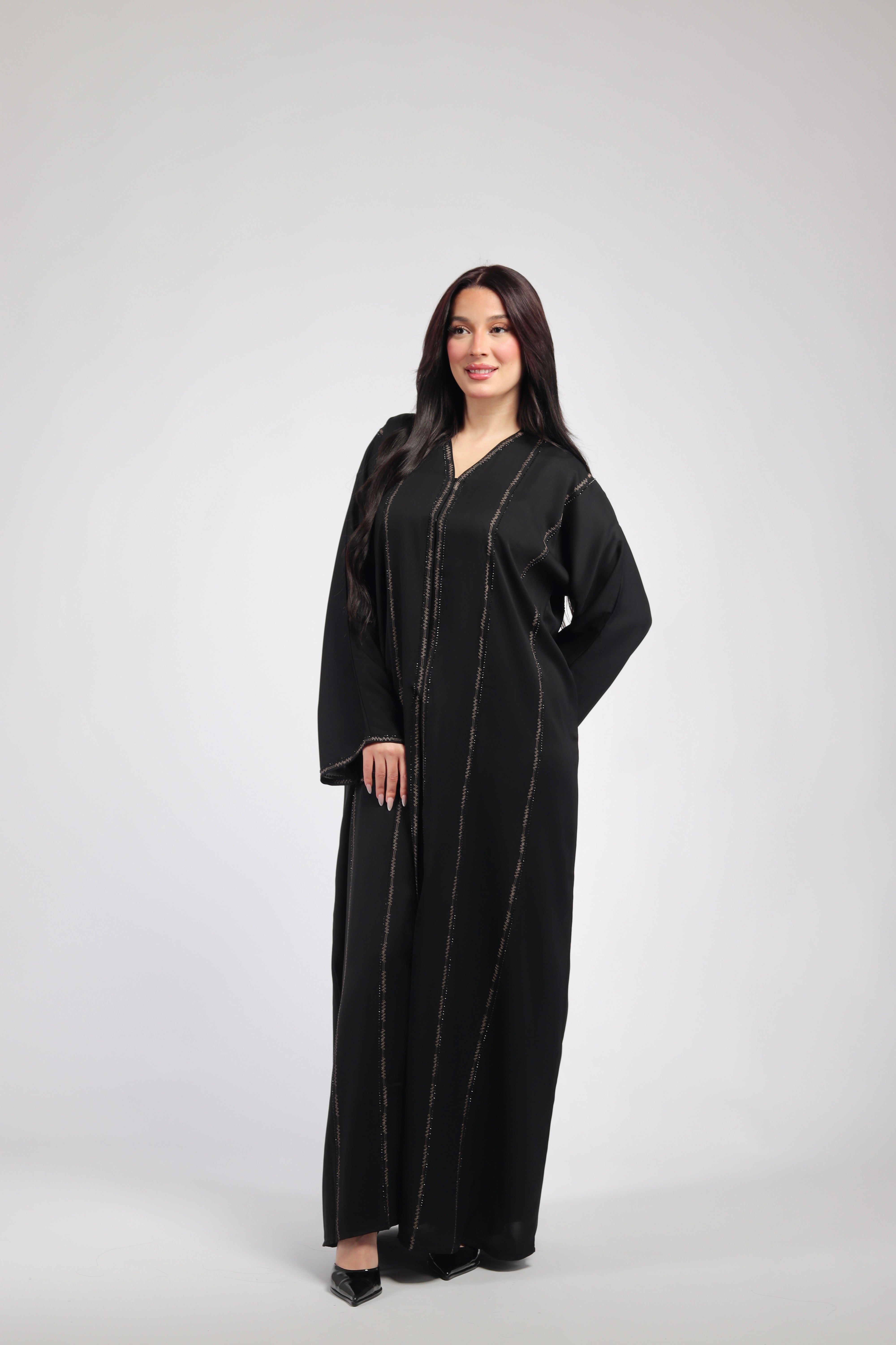 What truly sets this abaya apart are the stunning embroidered details that add a layer of timeless elegance. Expertly stitched, the embroidery enhances the abaya’s flowing lines, giving it a graceful, high-end look that elevates any outfit. The intricate patterns are a nod to classic Middle Eastern artistry, while the overall design maintains a modern, refined feel. These details add depth and texture to the abaya, making it a statement piece that effortlessly blends tradition with contemporary style.