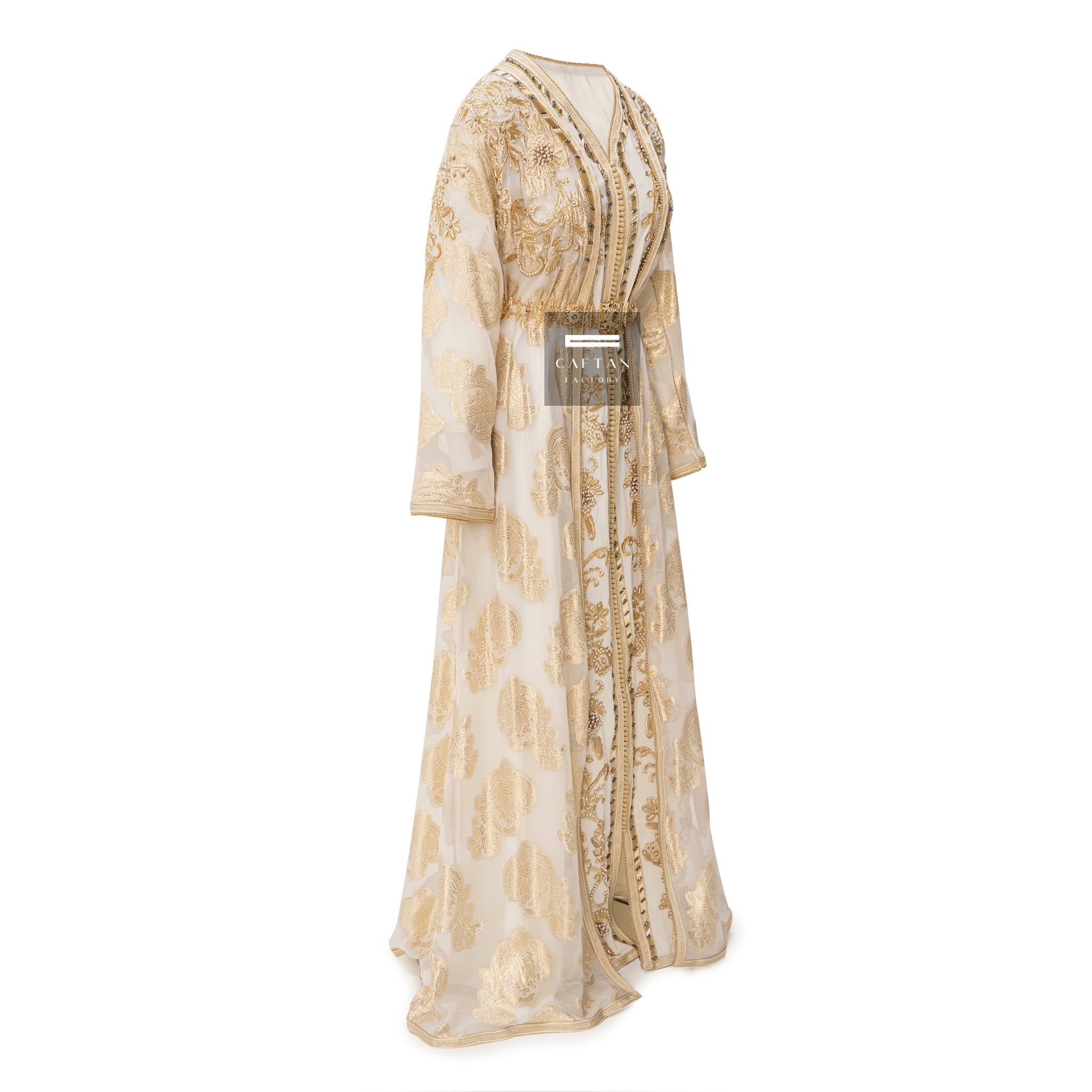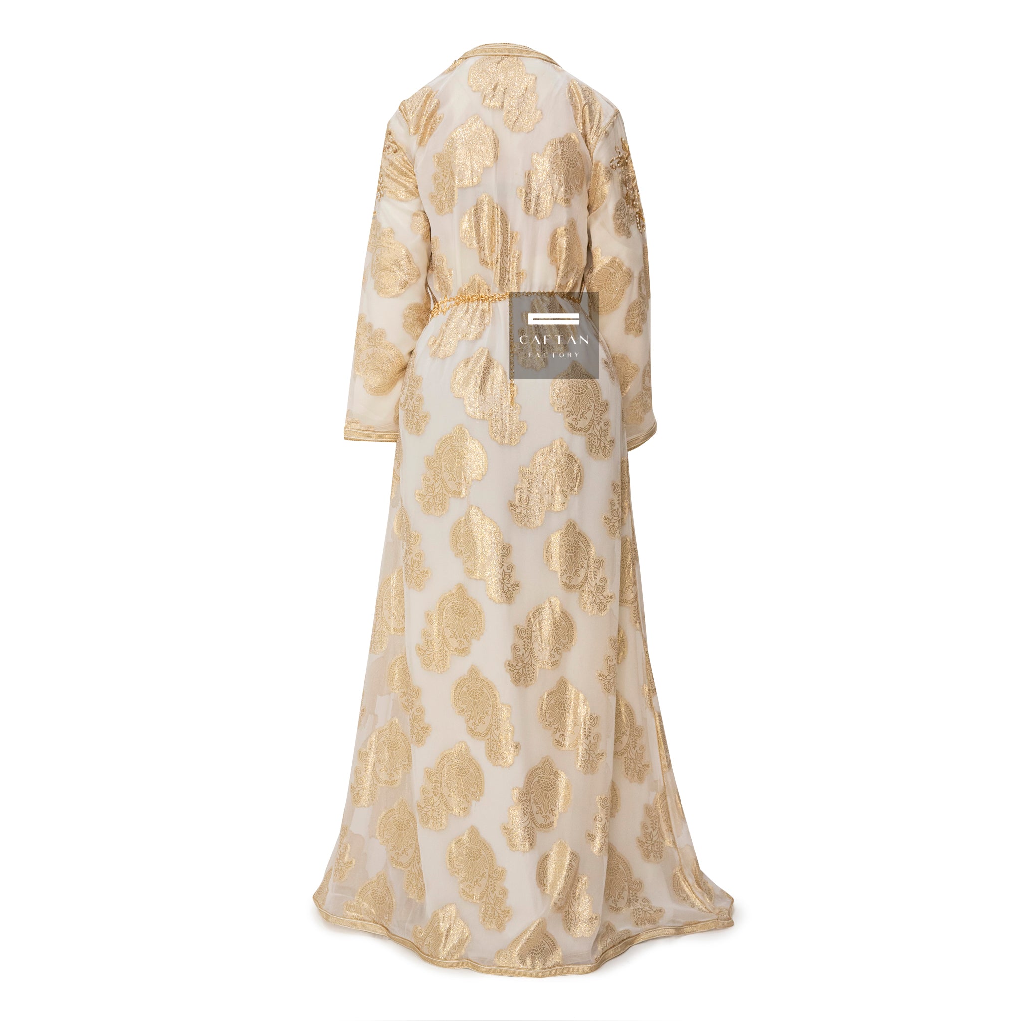 The upper dress of our Takchita is a testament to the allure of the traditional Tlija fabric. This famous Moroccan textile is known for its unique texture and intricate patterns, making it an integral part of Moroccan culture. Our Takchita does justice to this extraordinary fabric by incorporating golden details, adding an extra layer of sophistication and glamour.